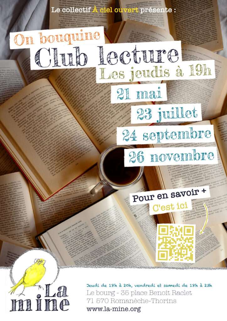 Vous aimez lire, échanger, découvrir de nouvelles histoires et partager vos coups de cœur ? Alors, le club de lecture de LA MINE est fait pour vous ! Notre club est un espace convivial où la passion des livres rassemble. C’est l’occasion d’enrichir vos horizons littéraires, d’explorer ensemble les trésors de la littérature dans une ambiance détendue et conviviale.